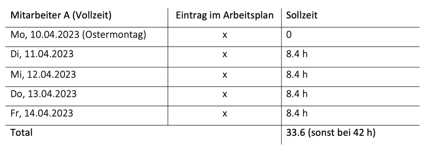 Für den Mitarbeiter A fällt der Ostermontag als Arbeitstag weg. Seine Sollzeit hat sich um 8.4h reduziert.
