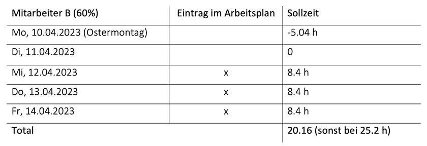Mitarbeiter B erhält am Ostermontag eine Pensums-abhängige Sollzeitreduktion. Also 60% von 8.4 Stunden (= 5.04 Stunden). Da dies kein Arbeitstag darstellt, erhält der Mitarbeitende für diese Woche eine Zeitgutschrift von 5.04 Stunden (in Form von Sollzeit-Abzug, -5.04 Stunden).