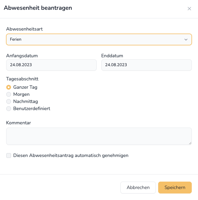 2. Fülle den Abwesenheitsantrag ab (siehe Bild rechts)