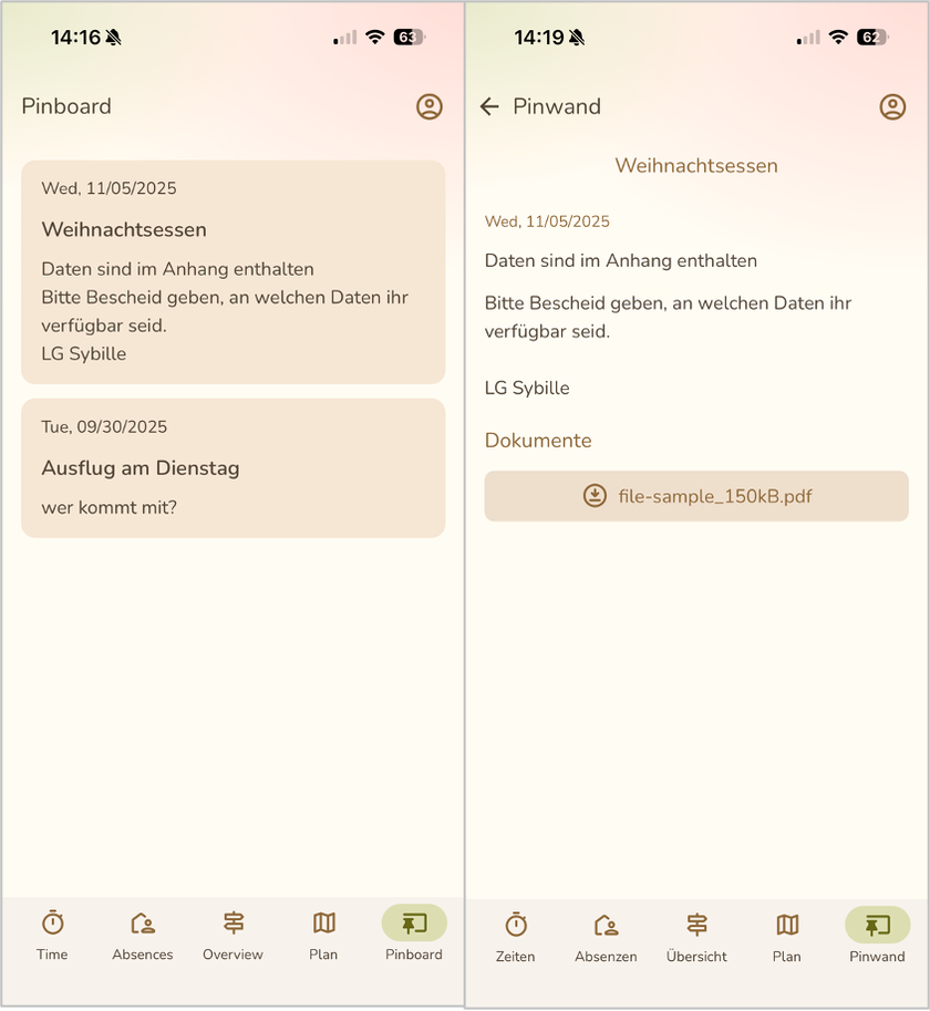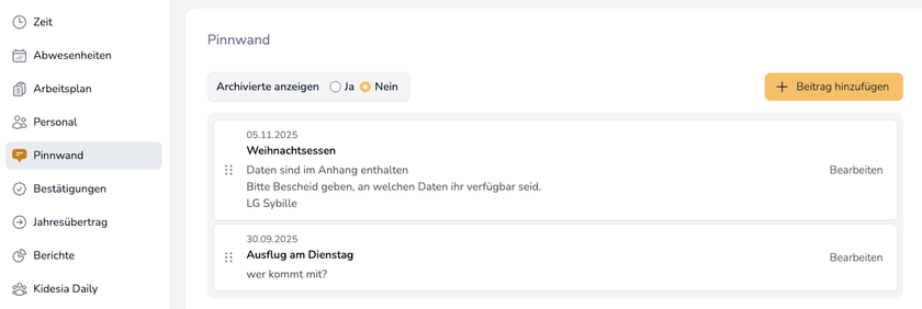 Die Einträge sind nach dem Speichern unter dem Menüpunkt Pinnwand in der Timesia App verfügbar.
