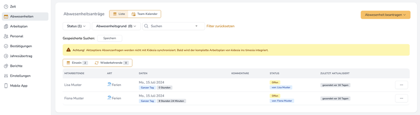 - Status-Filter: Offen, Genehmigt, Abgelehnt, widerrufen