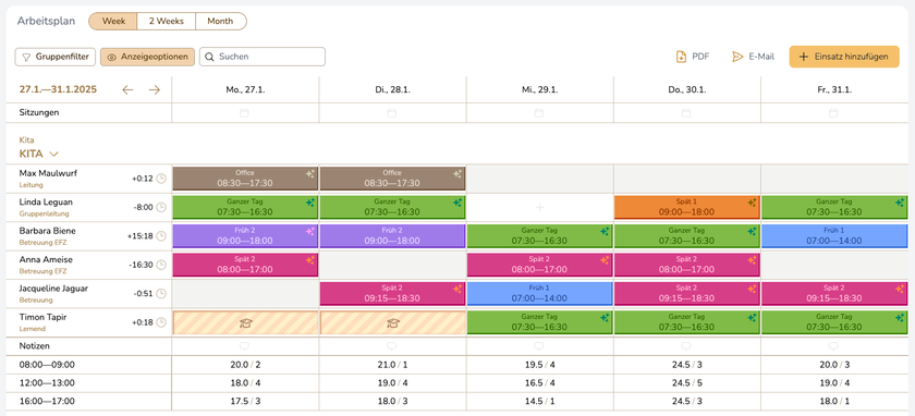 Im Arbeitsplan können die Einsätze der Mitarbeitenden organisiert werden. Dank der Anzeige der aktuellen Kinderzahl lässt sich der Personaleinsatz optimal steuern. Zudem kann der Arbeitsplan problemlos mit den Mitarbeitenden geteilt werden.