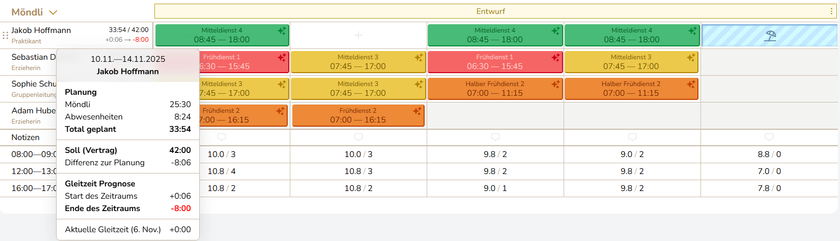 Beim Überfahren (Hovern) der Zeitangaben rechts neben dem Nutzernamen wir dein Tooltip mit vielfälltigen SOLL-, IST-, Plan- und Prognosearbeitszeiten für diese Person angezeigt, welche bei der Planung behilflich sein können.