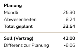 - Zeile Differenz zur Planung: Zeigt die Differenz zwischen den beiden Werten "Total geplant" und "Soll (Vertrag)", also wie viel Zeit noch eingeplant werden müssten, um die vertragliche Soll-Zeit zu erreichen. In unserem Beispiel wurde die Person für 33 Stunden 54 Minuten geplant, hat aber eine Soll-Zeit von 42 Stunden. Somit müssten noch 8 Stunden und 6 Minuten im Arbeitsplan eingetragen werden, um die vertragliche Soll-Zeit zu erreichen.