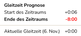 - Zeile Ende des Zeitraums: Zeigt die Prognose des Gleitzeitkontingents am Ende des ausgewählten Zeitraums. Es wird der Wert "Start des Zeitraums" mit dem Wert "Differenz zur Planung" addiert. In unserem Beispiel hat die Person eine Differenz zur Planung von minus 8 Stunden und 6 Minuten - diese Zeit wird mit +6 Minuten (Start des Zeitraums) addiert wodurch sich eine prognostizierte Gleitzeit von -8 Stunden für Ende der Woche ergibt.