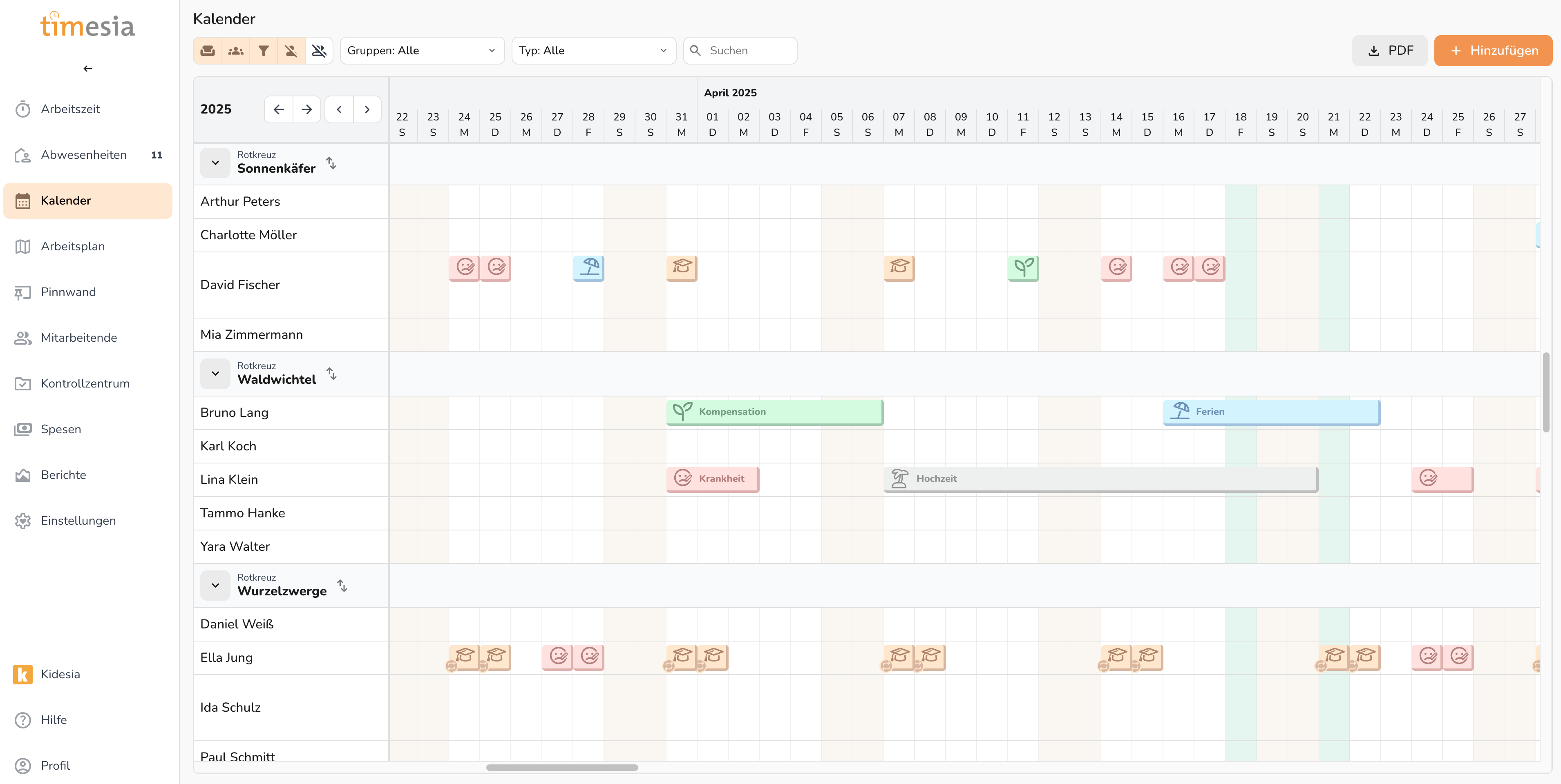 Abbildung 1: Abwesenheitskalender – Monatsübersicht mit Mitarbeitenden nach Gruppen und farblich markierten Abwesenheitstypen