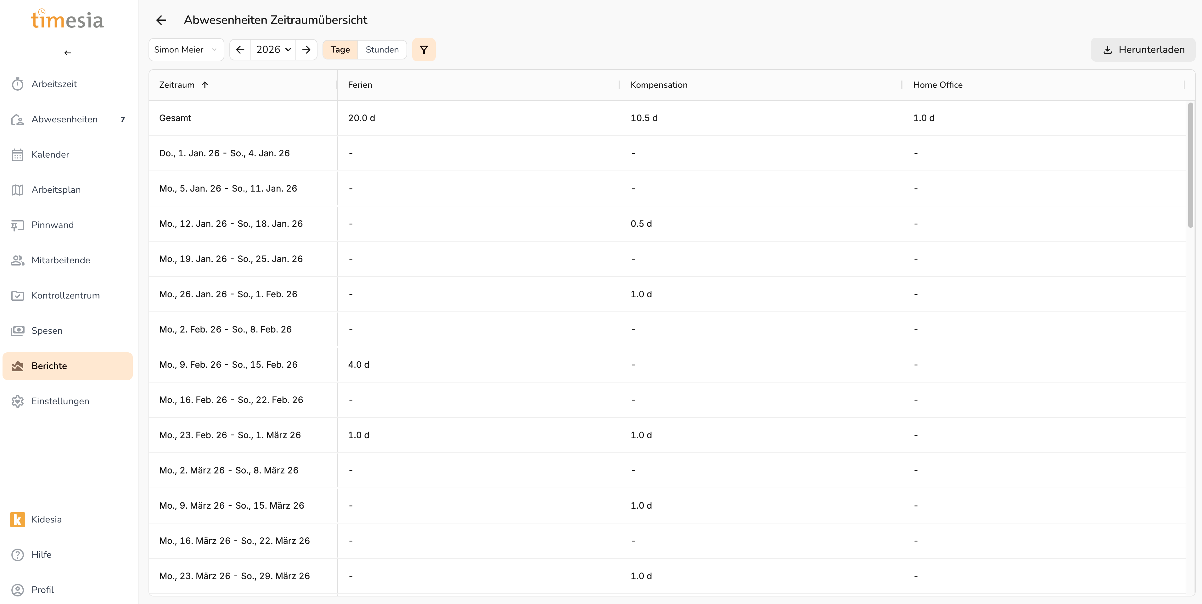 Abschnitt betitelt „Übersicht der Abwesenheiten“Tabellarische Übersicht aller Abwesenheiten pro Person und Abwesenheitstyp für einen gewählten Zeitraum – in Tagen oder Stunden.