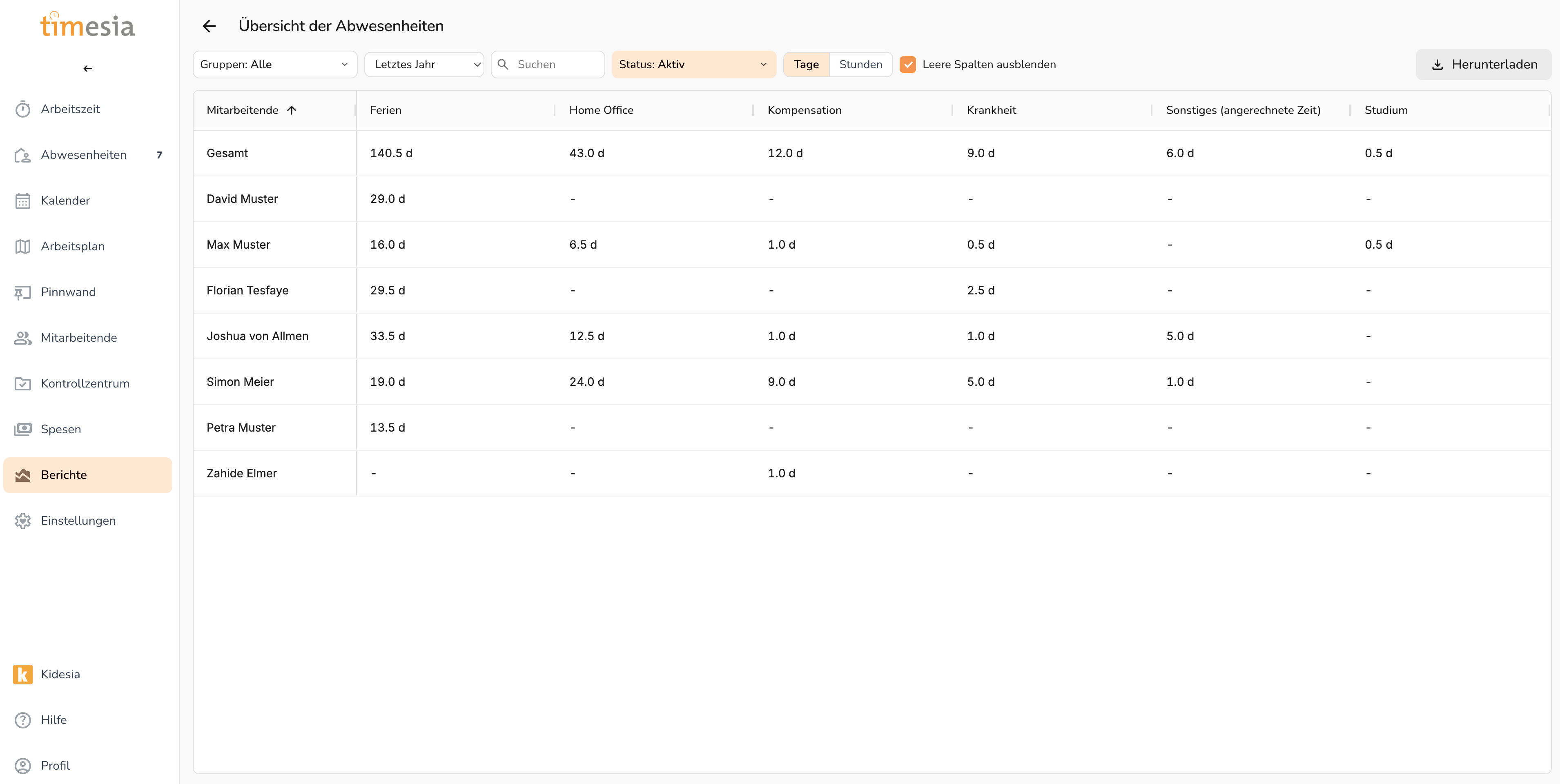 Abwesenheitsberichte geben eine strukturierte Auswertung der Abwesenheiten und des Ferien aller Mitarbeitenden.