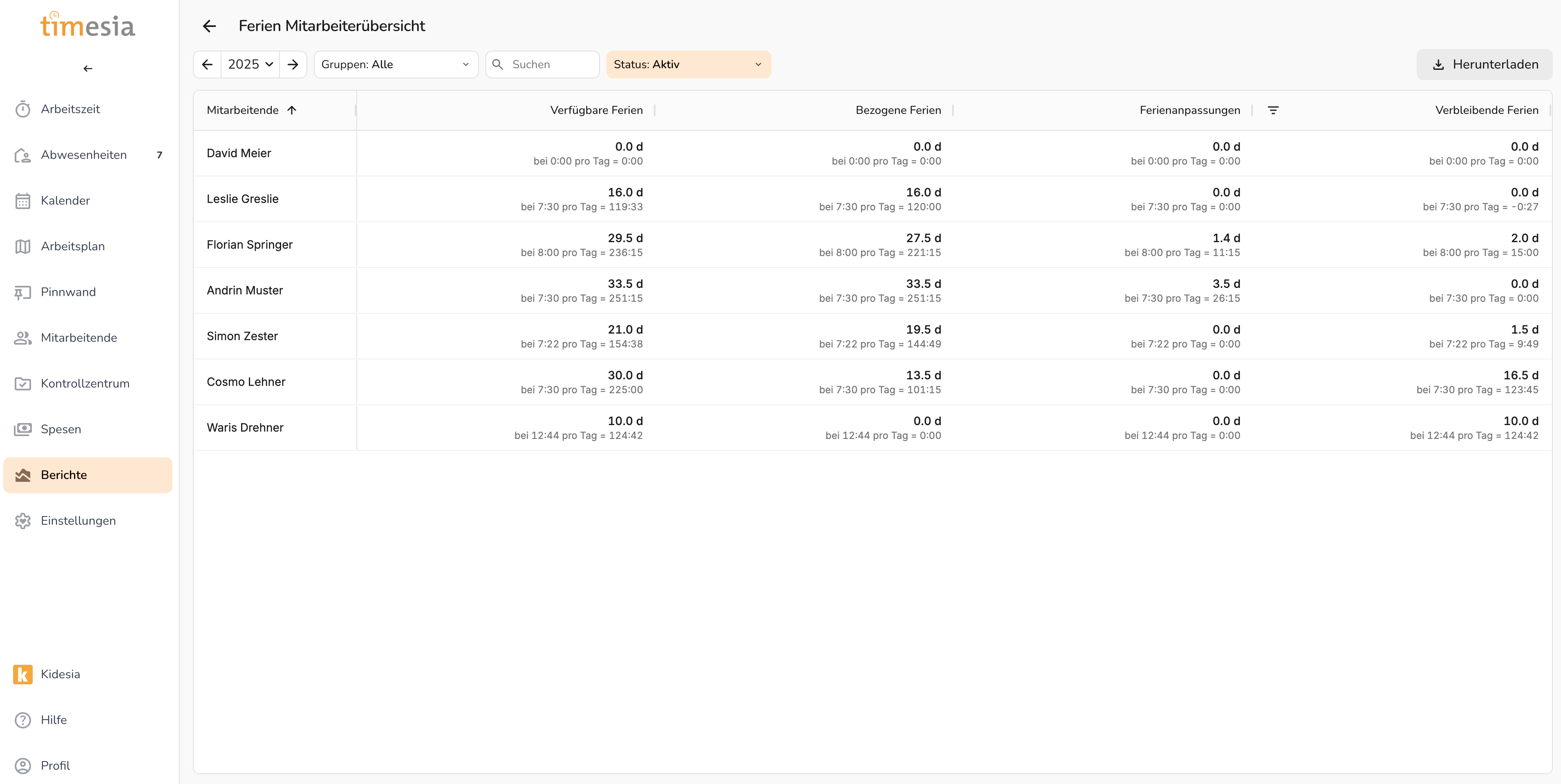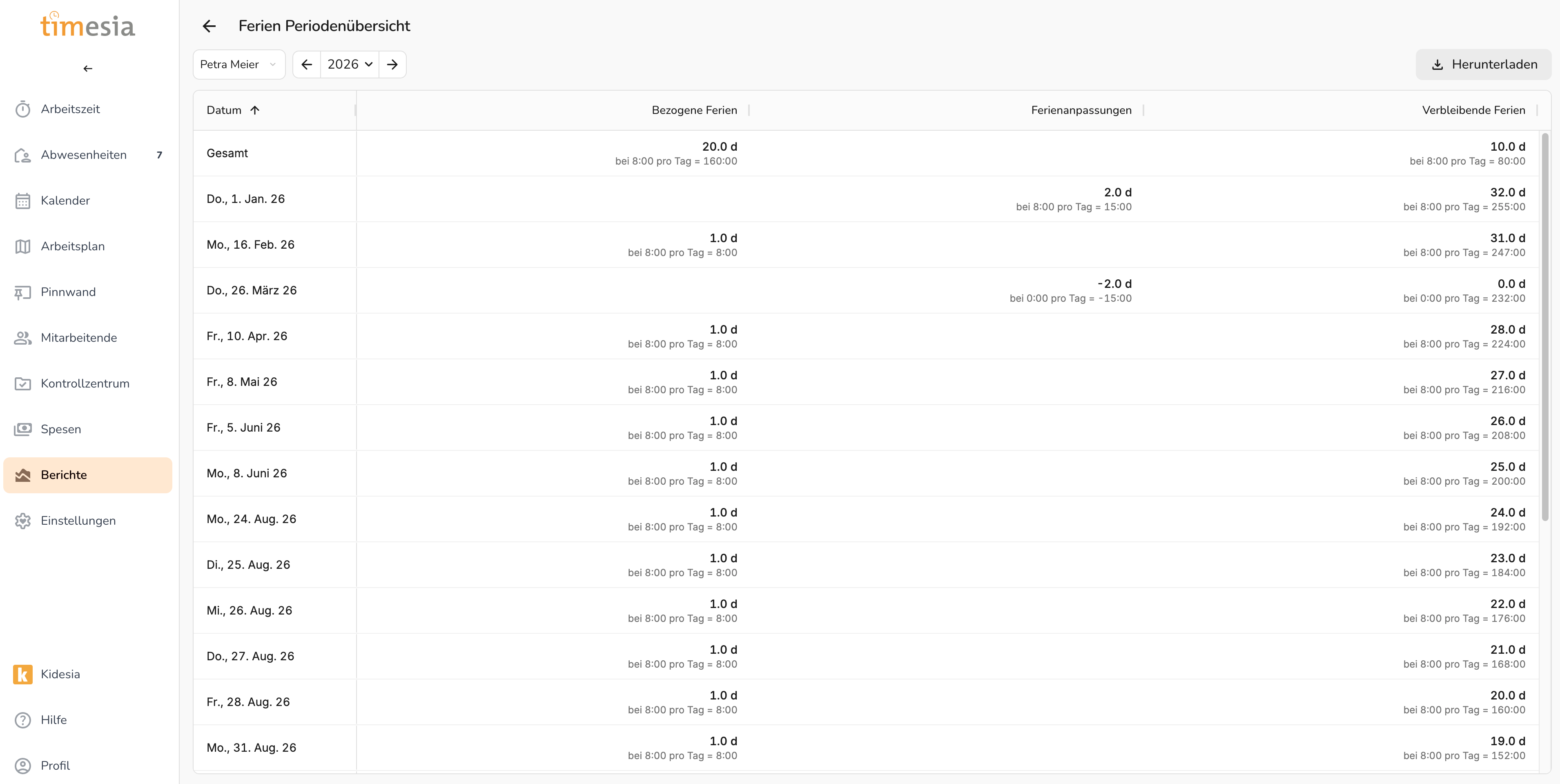 Abschnitt betitelt „Ferien pro Mitarbeitenden“Detaillierte Aufschlüsselung der bezogenen Ferien und verbleibenden Ferien einer Person in einem Kalenderjahr.