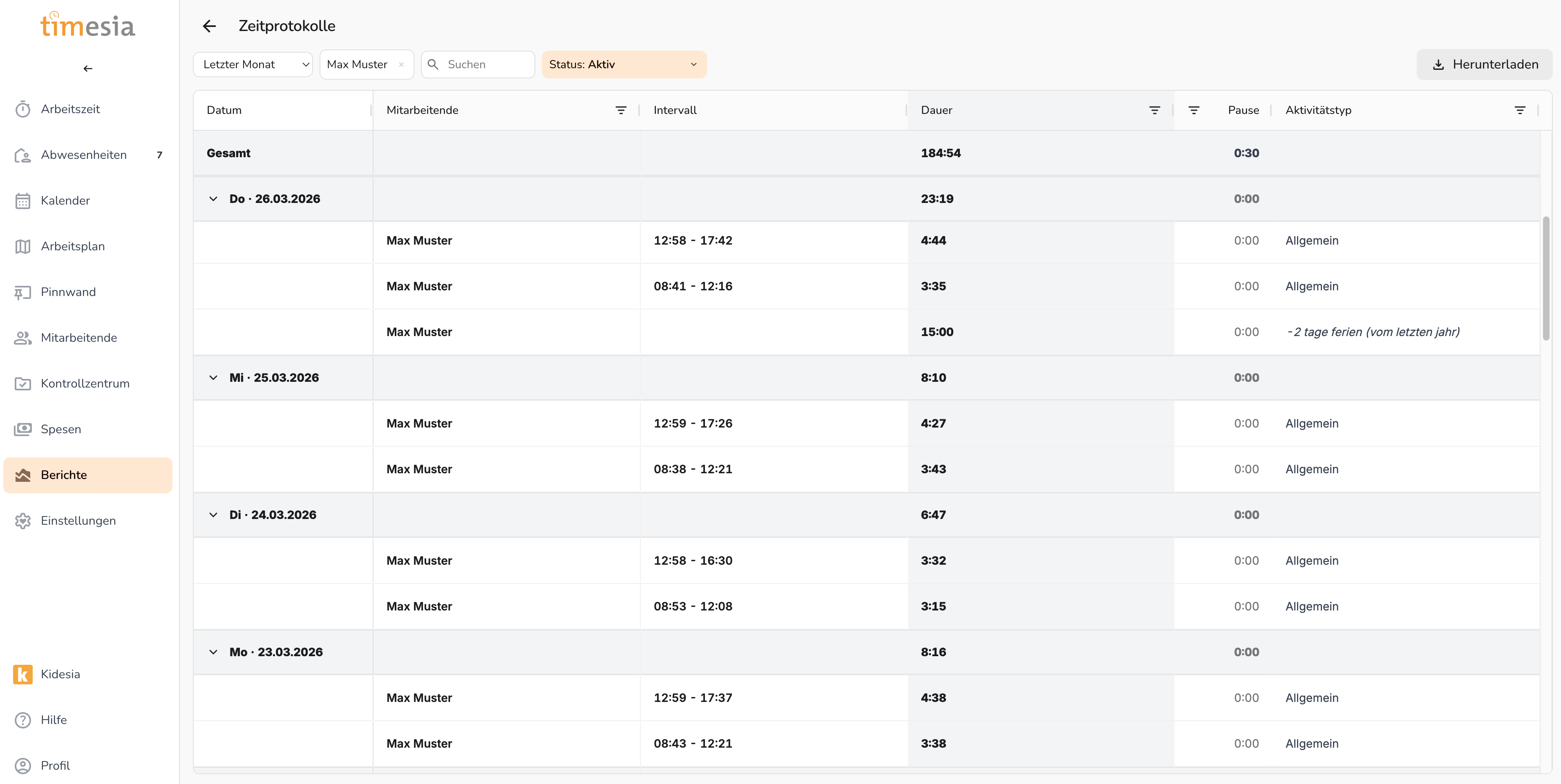 Abschnitt betitelt „Zeitprotokolle“Listet alle einzelnen Zeiteinträge des ausgewählten Zeitraums auf mit: