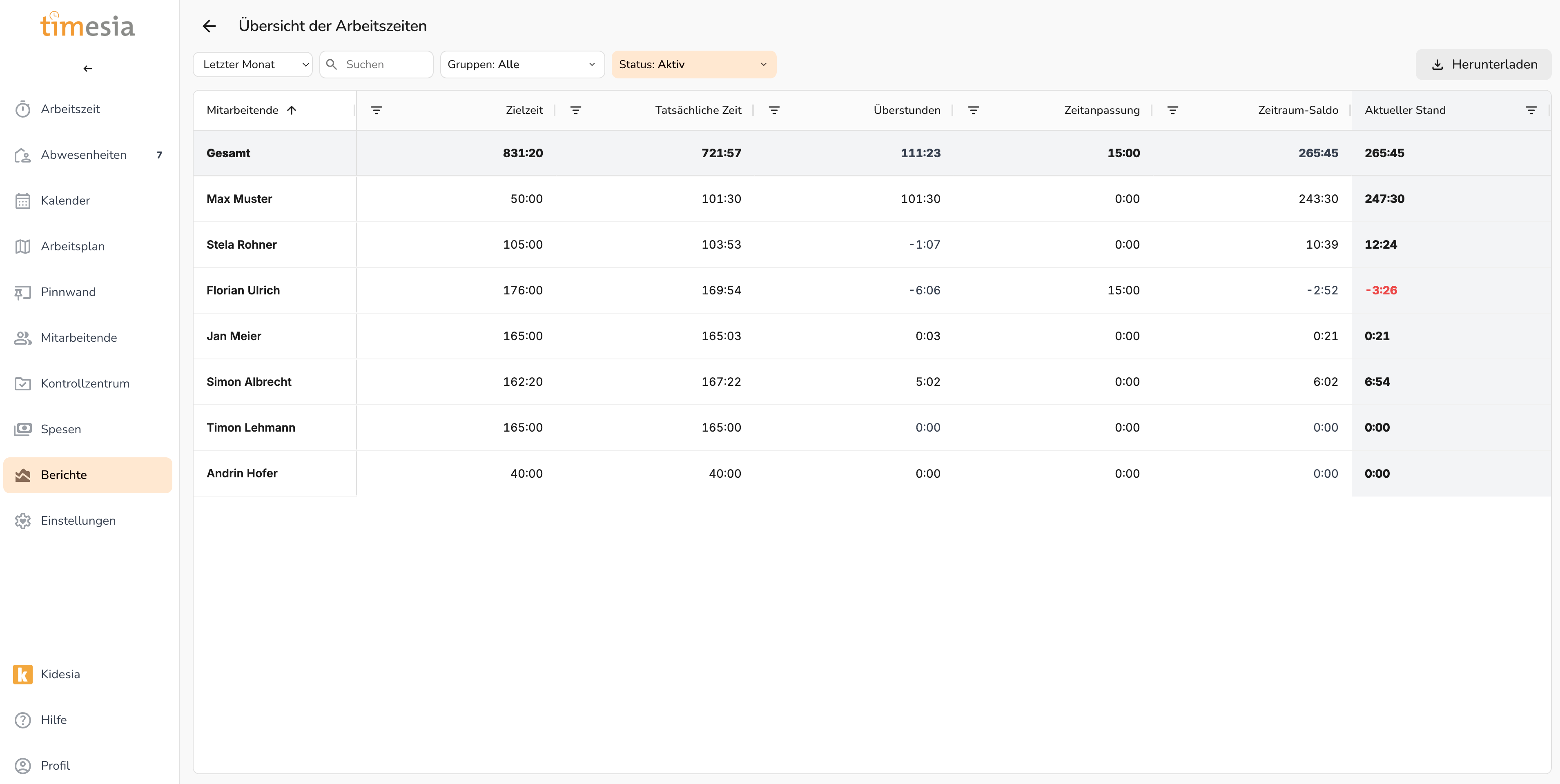 Abschnitt betitelt „Übersicht der Arbeitszeiten“Zeigt für alle Mitarbeitenden (oder eine Auswahl) im gewählten Zeitraum: