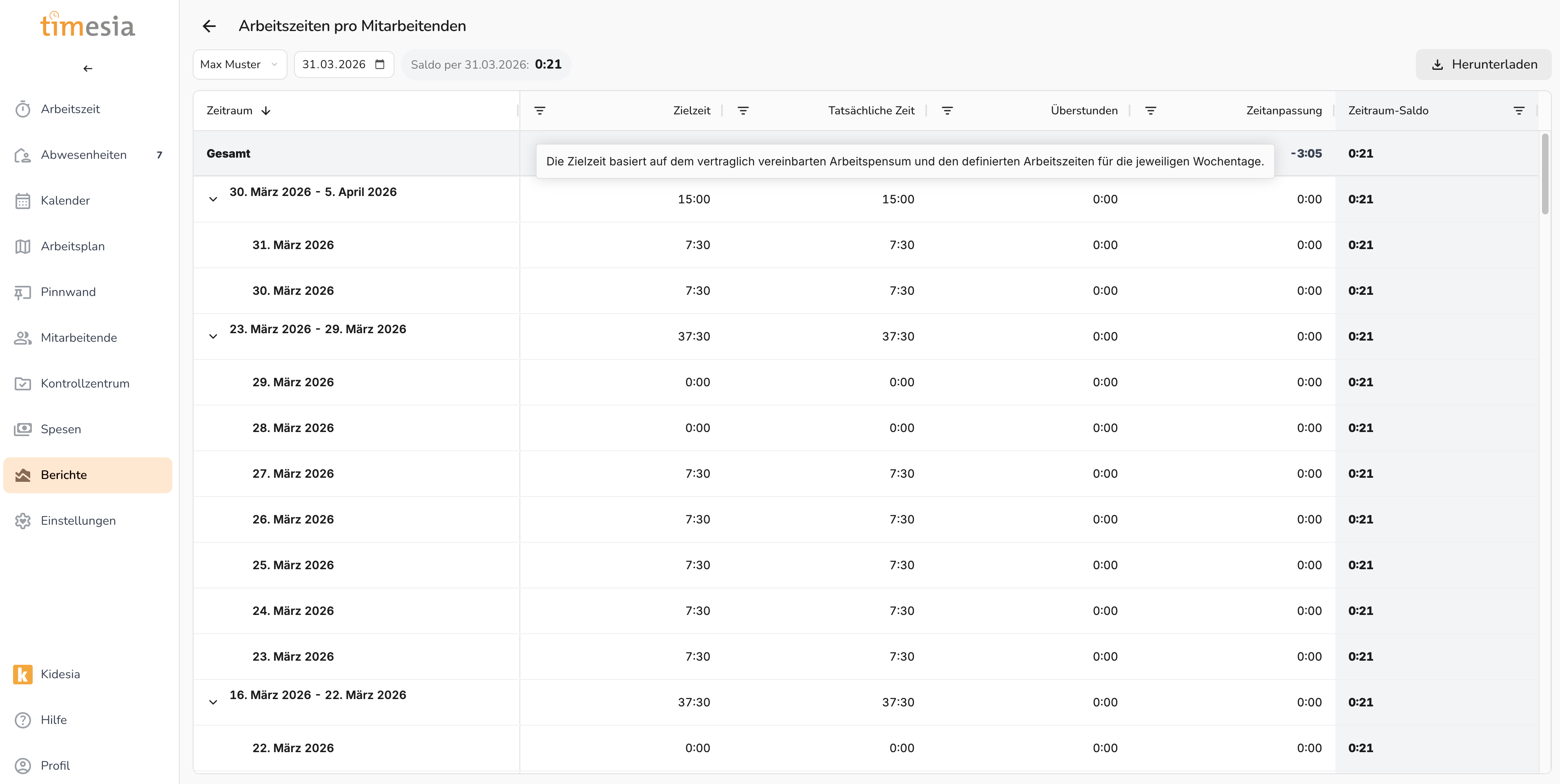 Abschnitt betitelt „Arbeitszeiten pro Mitarbeitenden“Detailliertere Ansicht pro Mitarbeitenden bis zu einem Stichtag. Enthält: