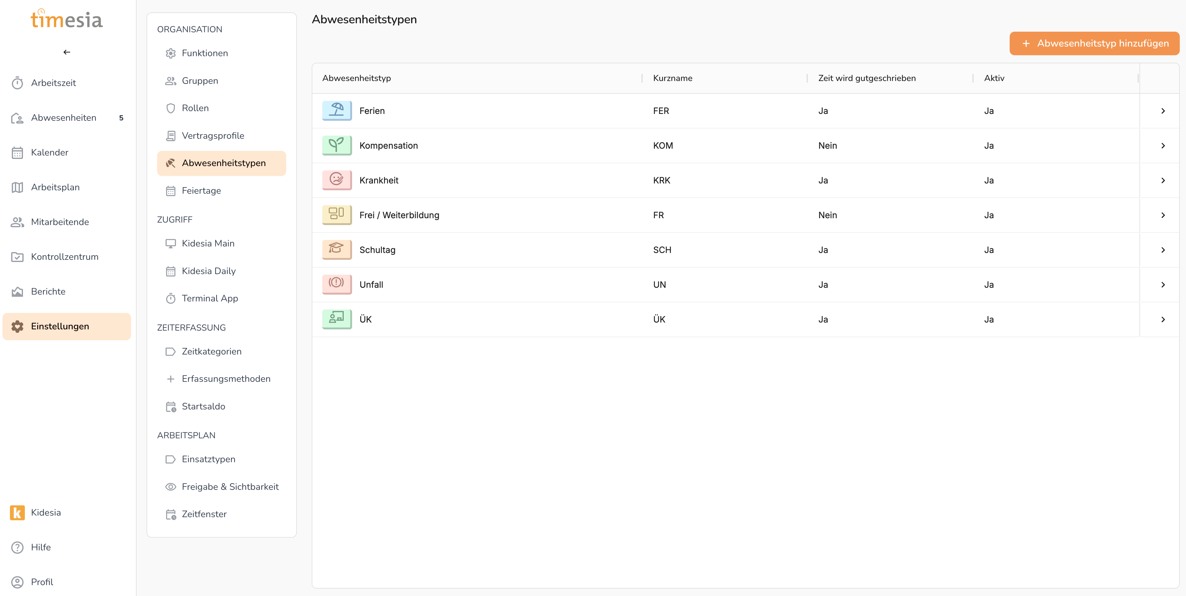 Abwesenheitstypen legen fest, welche Abwesenheitskategorien in der Organisation verwendet werden – z. B. Ferien, Krankheit, Kompensation oder Unfall.
