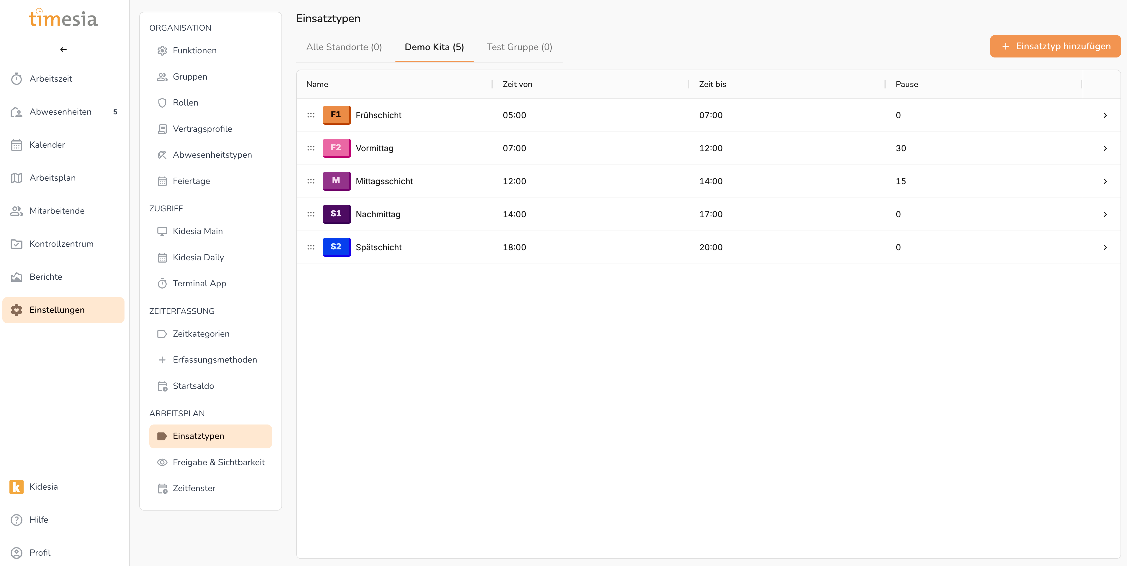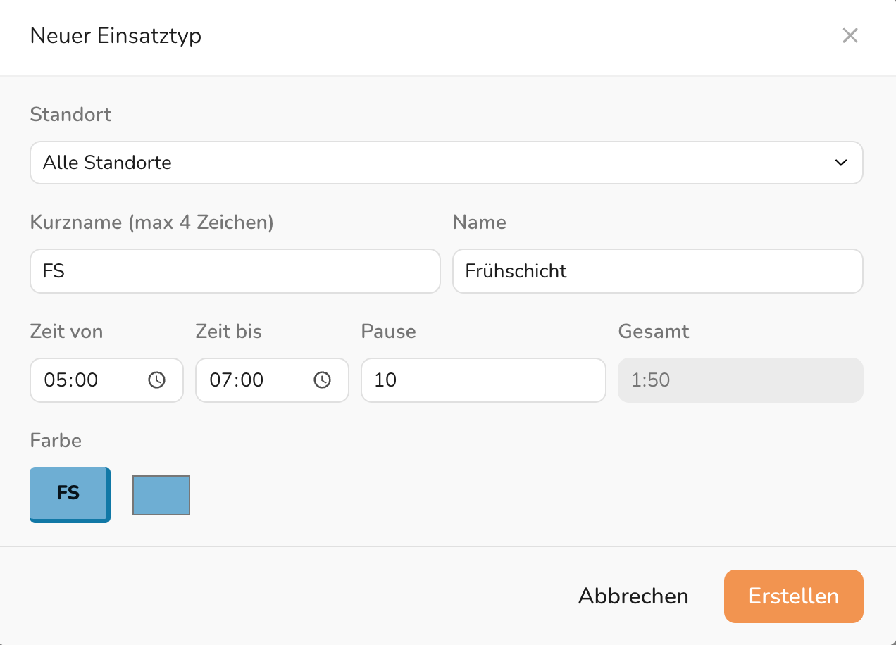 Einsatztypen sind Vorlagen für Schichten im Arbeitsplan. Statt jedes Mal Start- und Endzeit manuell einzugeben, kann ein vordefinierter Einsatztyp ausgewählt werden.