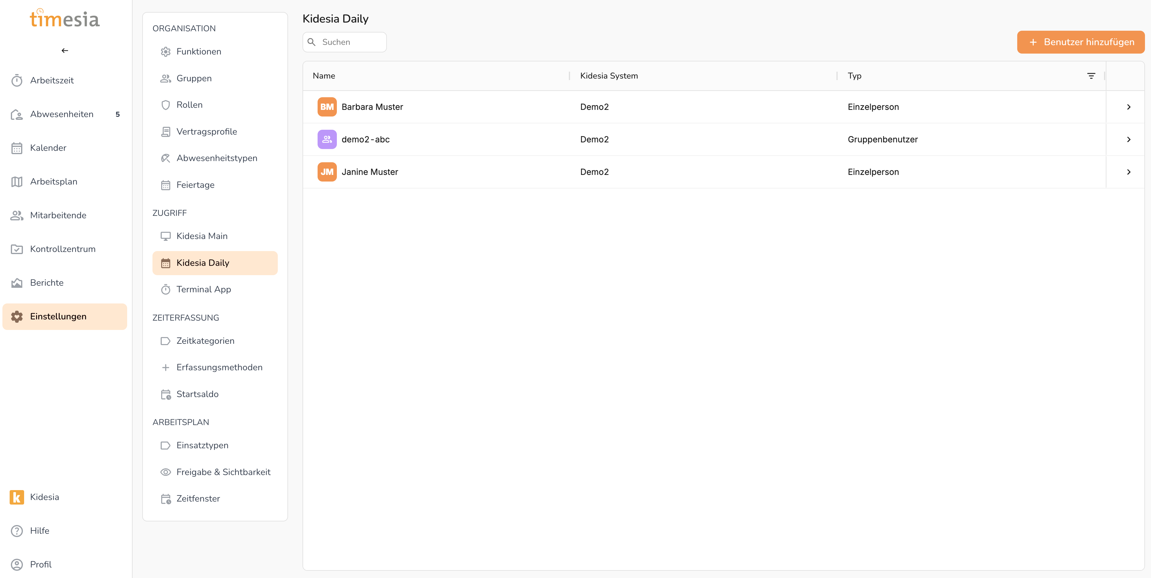 Kidesia Daily ist eine Mobile App, welche für die Mitarbeitenden auf der Gruppe verwendet werden kann. Unter Einstellungen → Kidesia Daily werden die Zugänge für Gruppen und Einzelpersonen verwaltet.