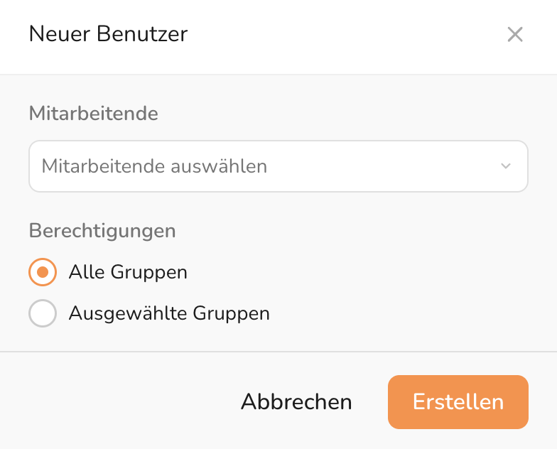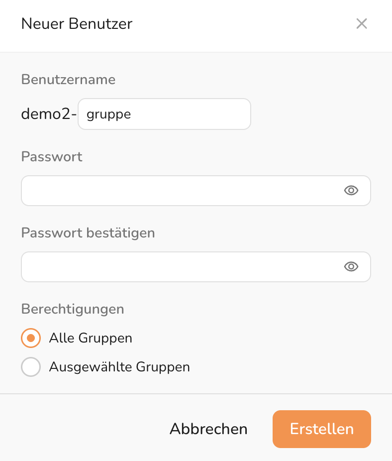 | Berechtigungen | Zugriff des Benutzers auf alle oder ausgewählte Gruppen |