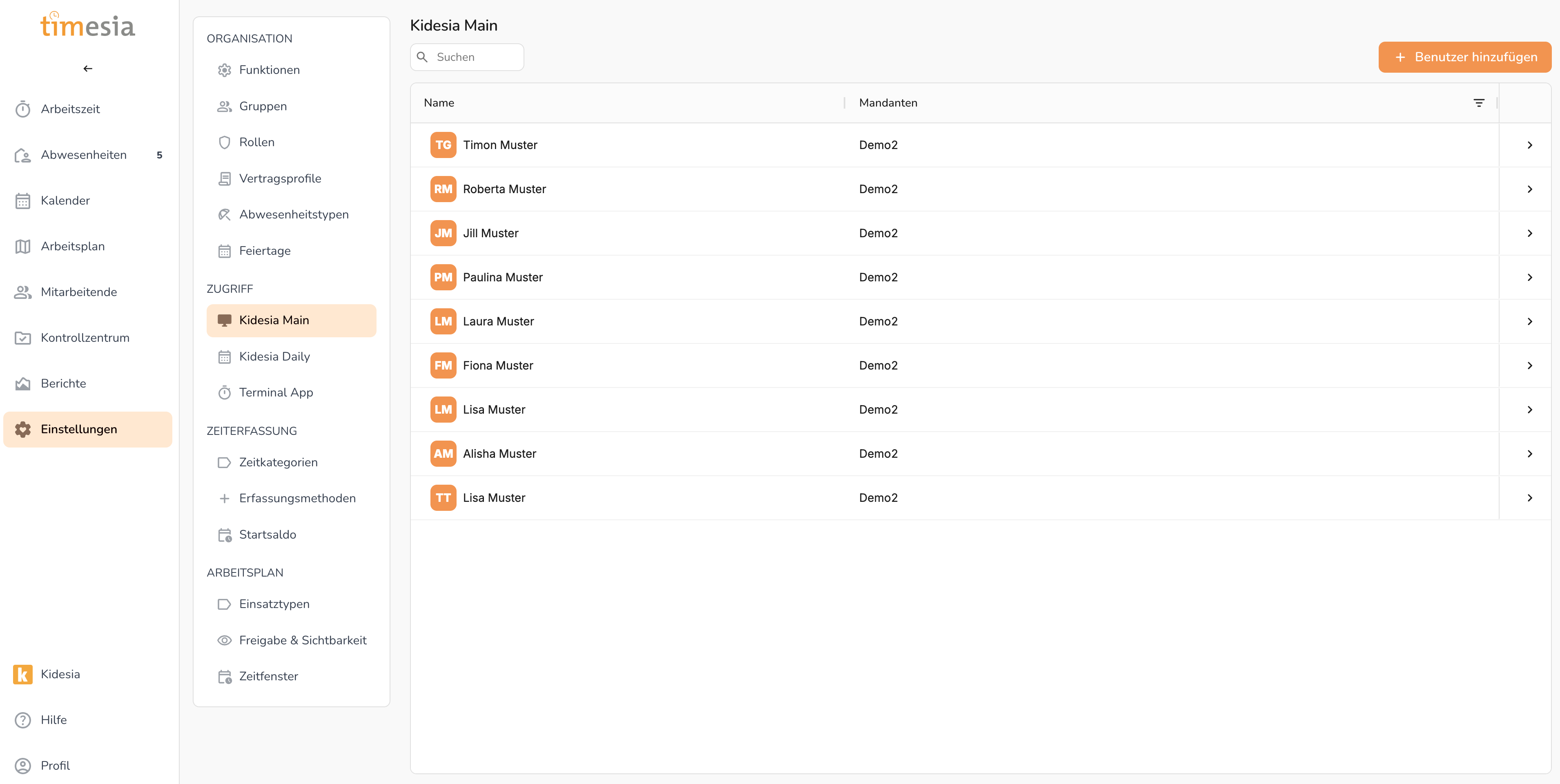 Die Kidesia Hauptplattform (oder Kidesia Main) ist das zentrale Verwaltungssystem für Kinderbetreuungseinrichtungen. Unter Einstellungen → Kidesia Main werden die Zugänge für Mitarbeitende zum Kidesia-System verwaltet.