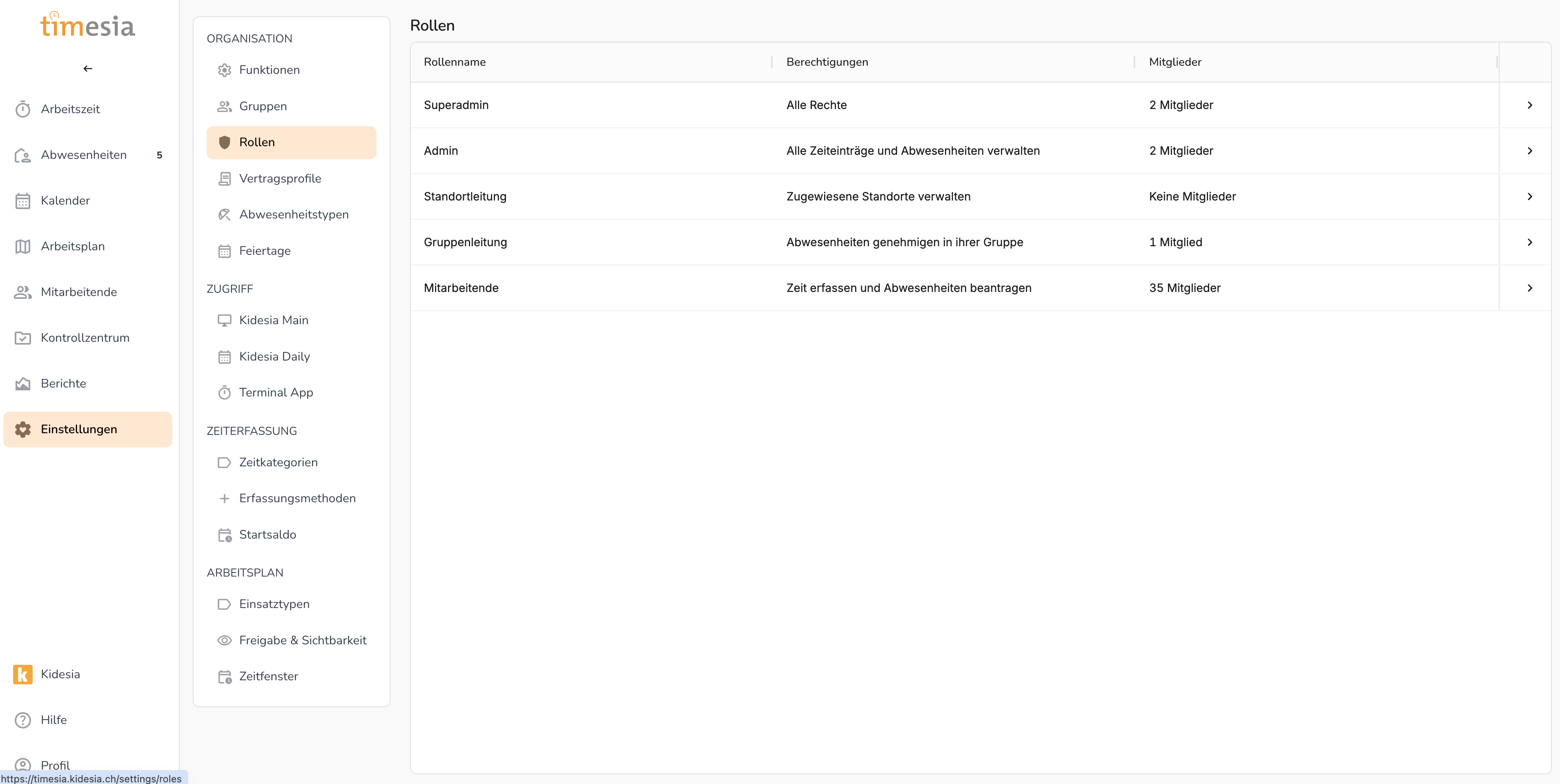 Rollen definieren die Berechtigungen für Mitarbeitende in Timesia. Jede Rolle hat spezifische Berechtigungen, die festlegen, welche Funktionen und Daten ein Mitarbeitender nutzen darf. Mit Klick auf die jeweilige Rolle, werden die Mitarbeitenden angezeigt, welche diese Systemrolle aufweisen.