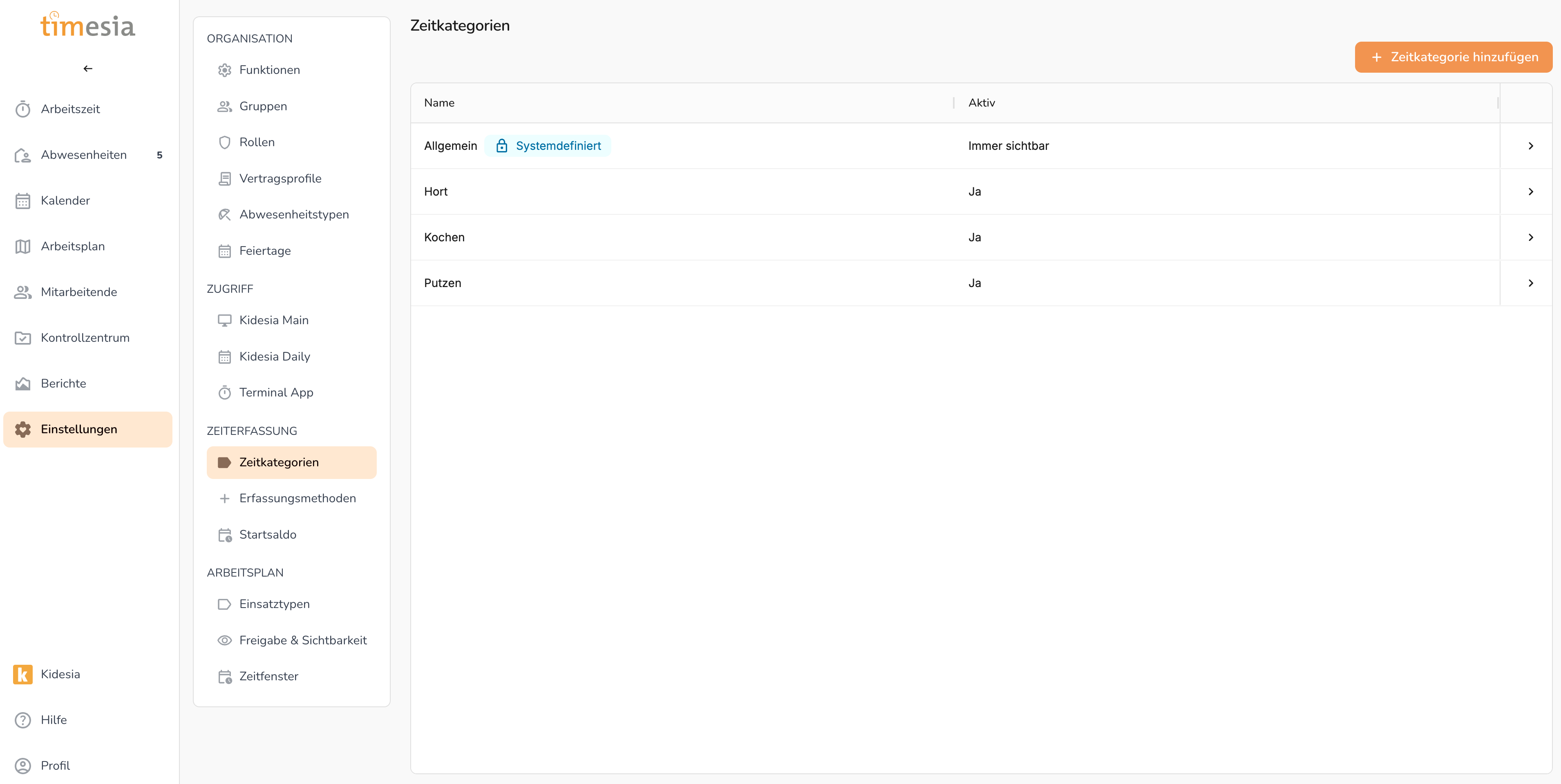 Zeitkategorien ermöglichen es, Zeiteinträge nach Tätigkeit zu kategorisieren – z. B. «Betreuung», «Verwaltung», «Ausbildung». Die Kategorien sind optional und können von Mitarbeitenden beim Erfassen eines Zeiteintrags ausgewählt werden.
