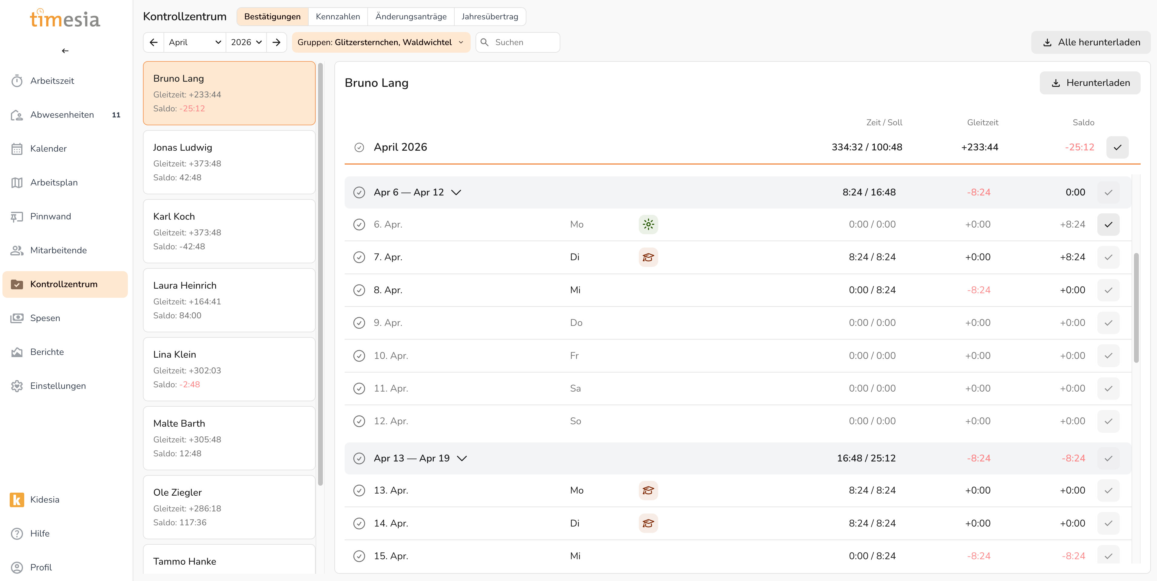 Über die Bestätigungsseite können (Super-)Admins und Führungspersonen (Standort-/Gruppenleiter, direkte Vorgesetzte) die erfassten Arbeitszeiten von Mitarbeitenden bestätigen.