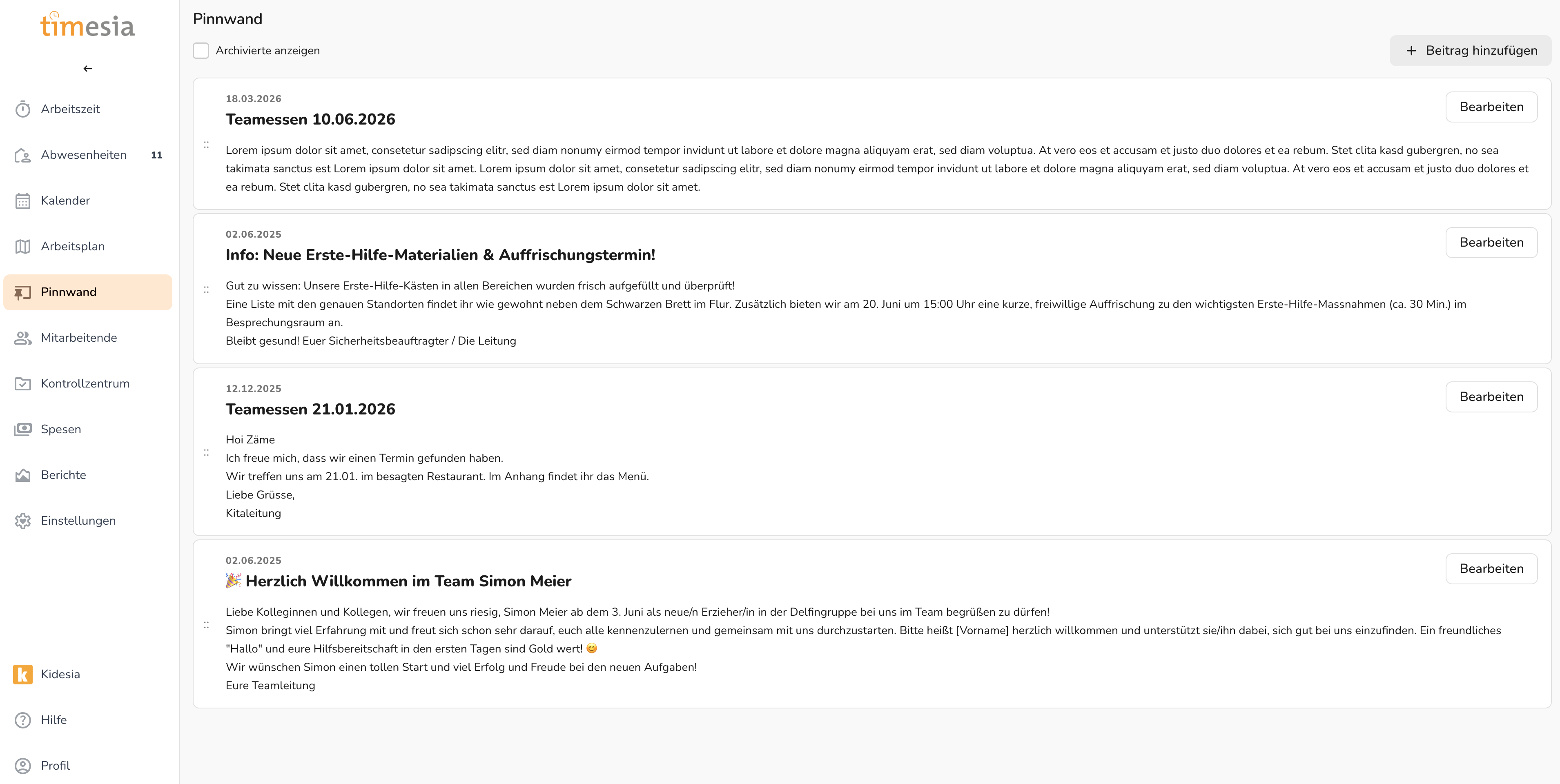 Die Pinnwand dient als internes Kommunikationsmittel. Admins und Führungspersonen können Beiträge für alle Mitarbeitenden veröffentlichen – z. B. Ankündigungen, Einladungen oder wichtige Infos. Für die Mitarbeitenden ist der Pinnwandeintrag auf der Timesia App ersichtlich.