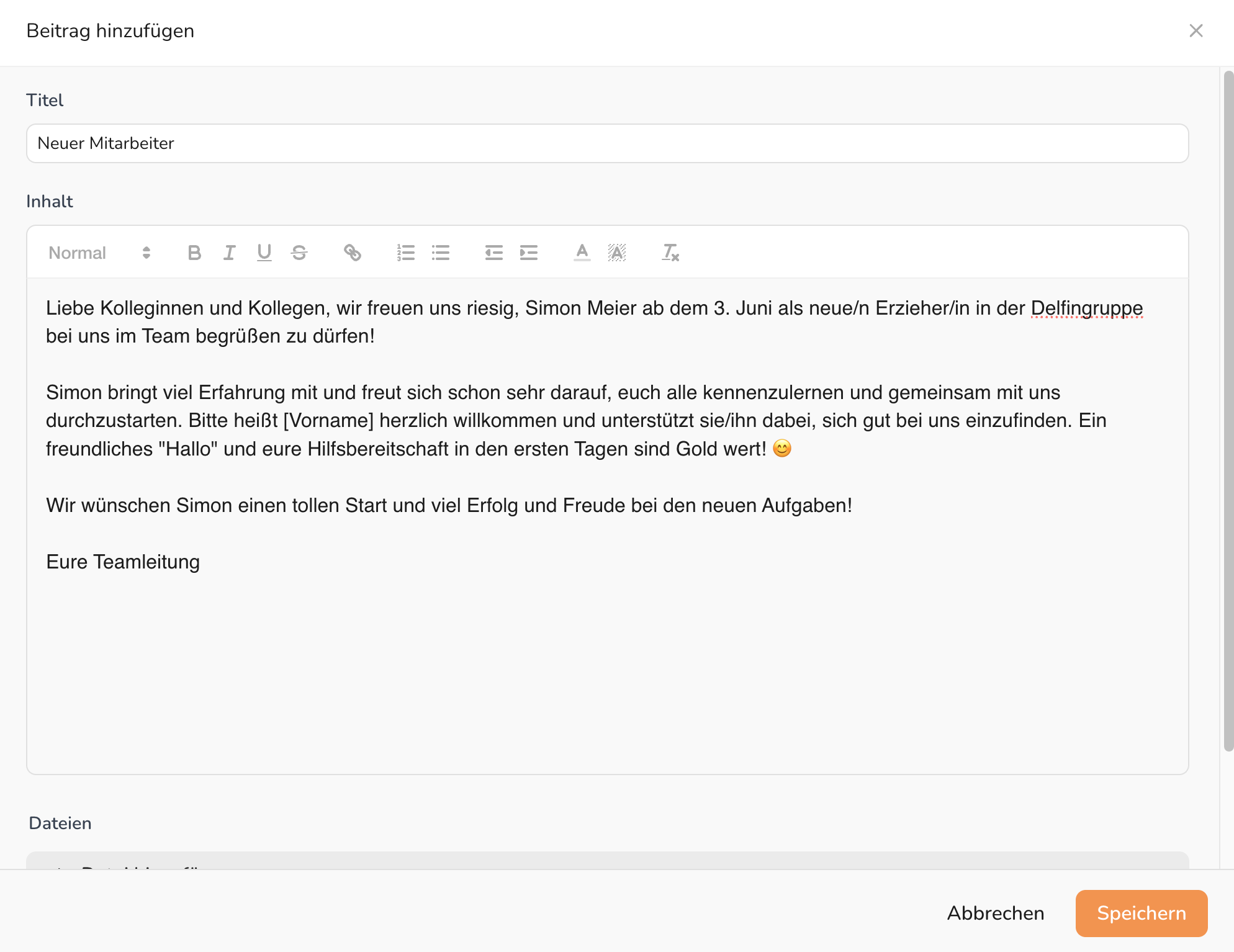 Abbildung 2: Dialog „Beitrag hinzufügen" mit Titel, Rich-Text-Editor und optionalem Dateianhang
