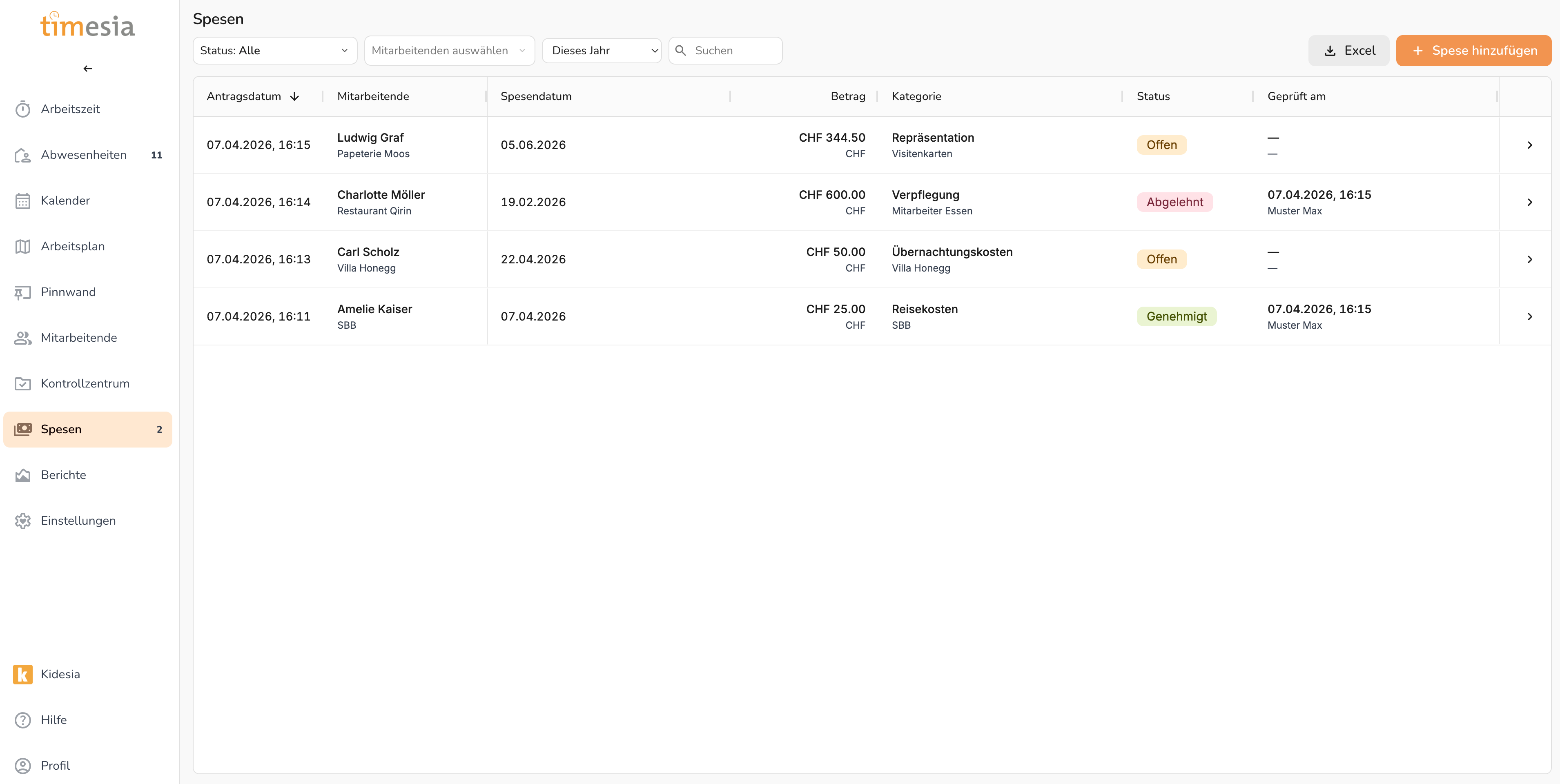 Das Spesen-Modul ermöglicht Mitarbeitenden über die Timesia App, Auslagen einzureichen, und gibt Admins eine strukturierte Übersicht zur Prüfung und Genehmigung.