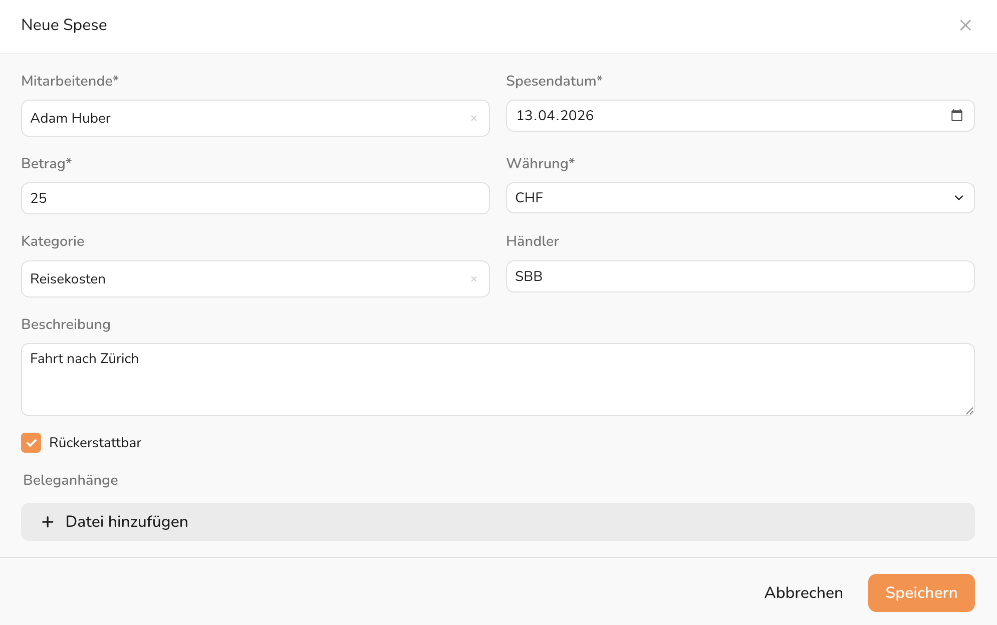 (Super-)Admins und Führungskräfte können eine neue Spese mit folgenden Angaben erfassen: