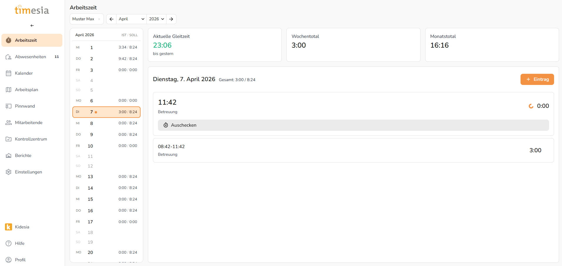 Abbildung 1: Übersicht der Zeiterfassung – Monatskalender (links), Gleitzeitkonto, Wochen- und Monatstotal (oben rechts) sowie Tageseinträge mit Check-in-Status
