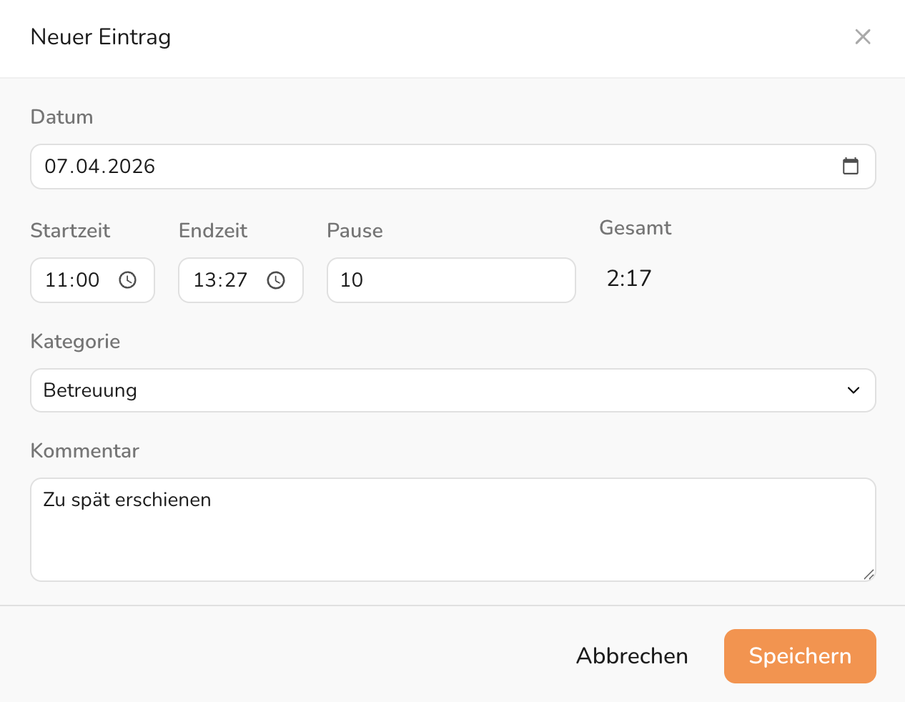 Abbildung 2: Dialog „Neuer Eintrag" – Eingabe von Datum, Start- und Endzeit, Pause, Kategorie sowie optionalem Kommentar